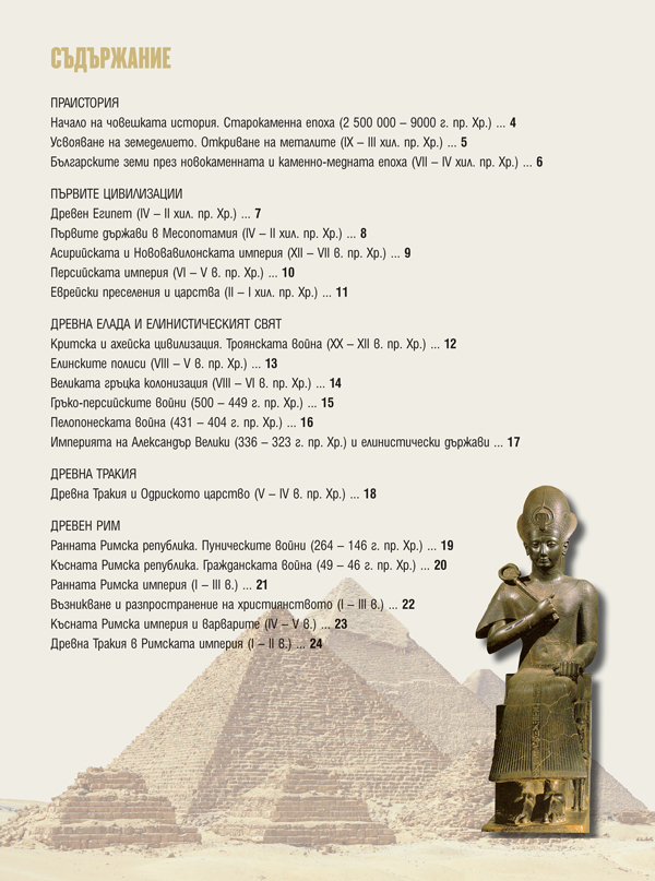Включените в атласа 26 панорамни учебни карти са четивни и съобразени с възможностите на петокласниците. Те представят всички исторически процеси, общества и държави от новата програма в нейните пет раздела: Праистория, Първите цивилизации, Древна Елада и елинистическият ...