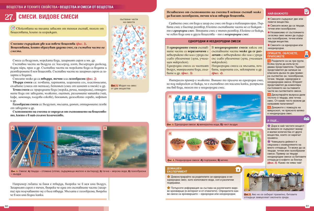 Учебникът е богато илюстриран и с висока степен на интеграция между физичното, химичното и биологичното учебно знание. Отразява съвременните постижения на природните науки в достъпен вид за ученици в 5. клас. В уроците са вложени елементи на изследователския, на проблемния и на еволюционния подход. Включени са множество лабораторни и домашни опити и задачи. Има редица упражнения с използване на интернет, както и творчески задачи, свързани с актуални проблеми за опазване на околната среда и човешкото здраве и измерване на различни величини във всекидневието.