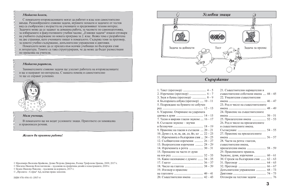 Добре известно и много харесвано, помагалото е преработено така, че да отговаря на актуалната учебна програма. Създадено от учители за учители, то може да се прилага към всички учебници по български език и литература. Темите са структурирани така, че учителят да ги ползва тогава, когато е необходимо според учебника, по който преподава. Задачите са разнообразни и занимателни и може да се дават за домашна работа, в часовете по самоподготовка или в избираемите и факултативните учебни часове. Авторите познават отлично възрастовите особености и способостите за възприемане на малките ученици и залагат на игровите похвати, които ангажират вниманието. Включени са и теми за преговор, допълнителни упражнения и диктовки. Направени са и много междупредметни връзки с математика, околен свят, музика, изобразително изкуство. В края на помагалото са дадени отговорите на тестовите задачи.